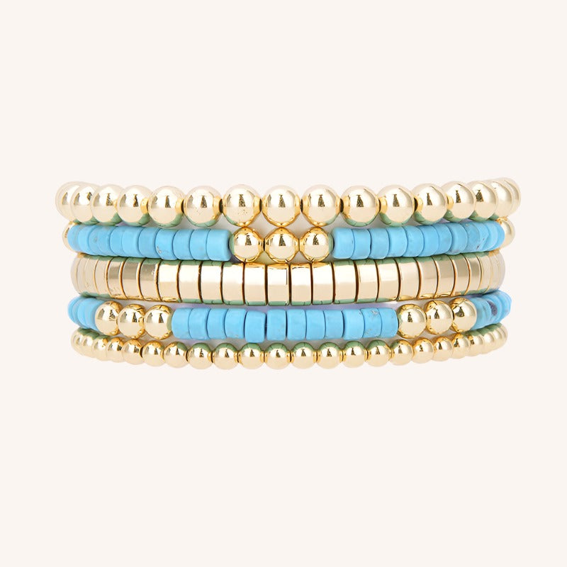 Each Stacking Set comes with it's own unique bracelets. Stacks may feature beads and crystals on an elastic cord, to sea shells on an adjustable drawstring, or even a gold bangle. This is what makes them so unique and perfect to collect.