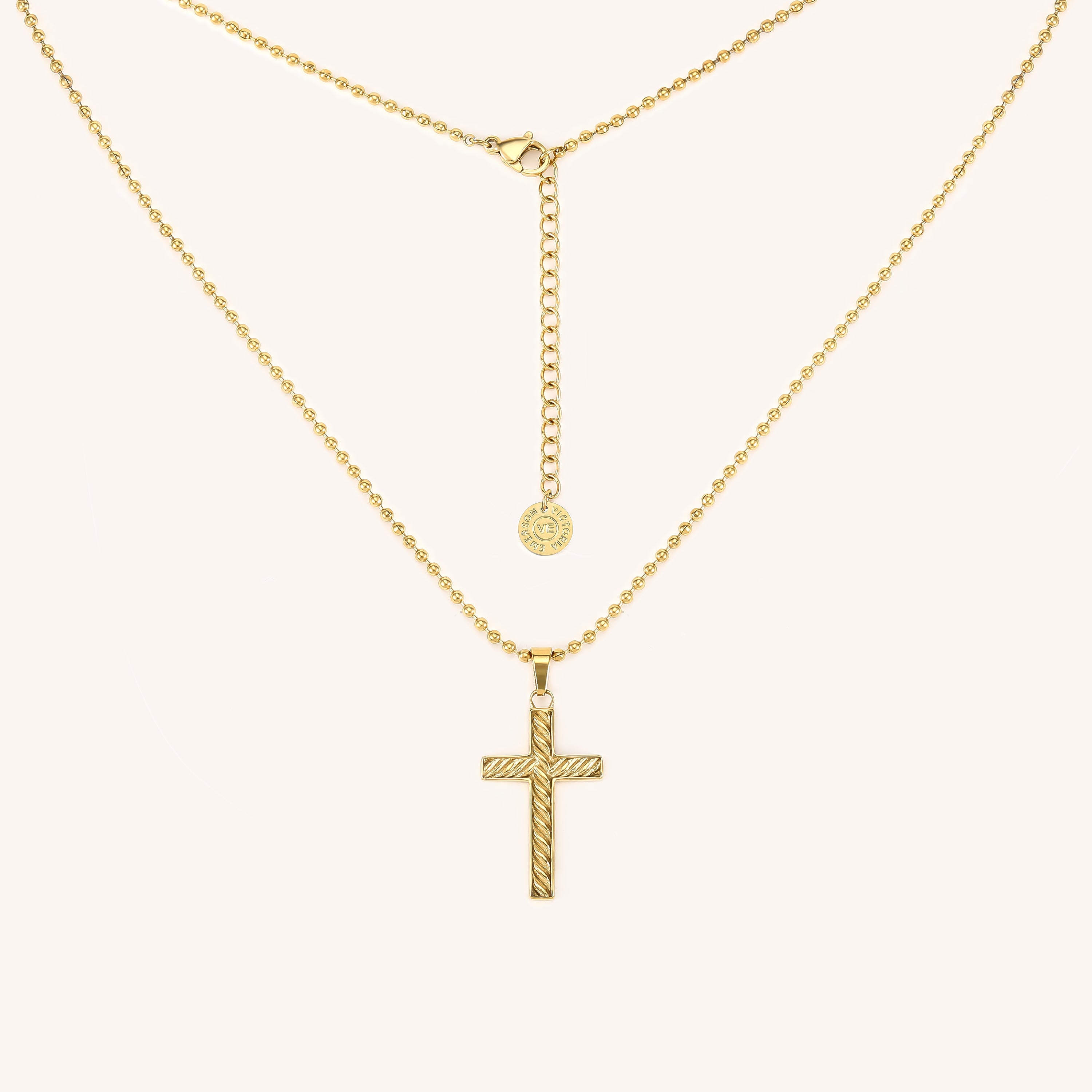 Crafted with a textured design, the Gold Cross Necklace elegantly symbolizes faith. This sophisticated accessory delivers a subtle shimmer, making it a timeless addition to any refined wardrobe.