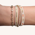 Stacked bracelets but all on one clasp. A youthful soda tab chain and bright seed beads are mixed with crystals and beads to make the perfect pre-layered piece.