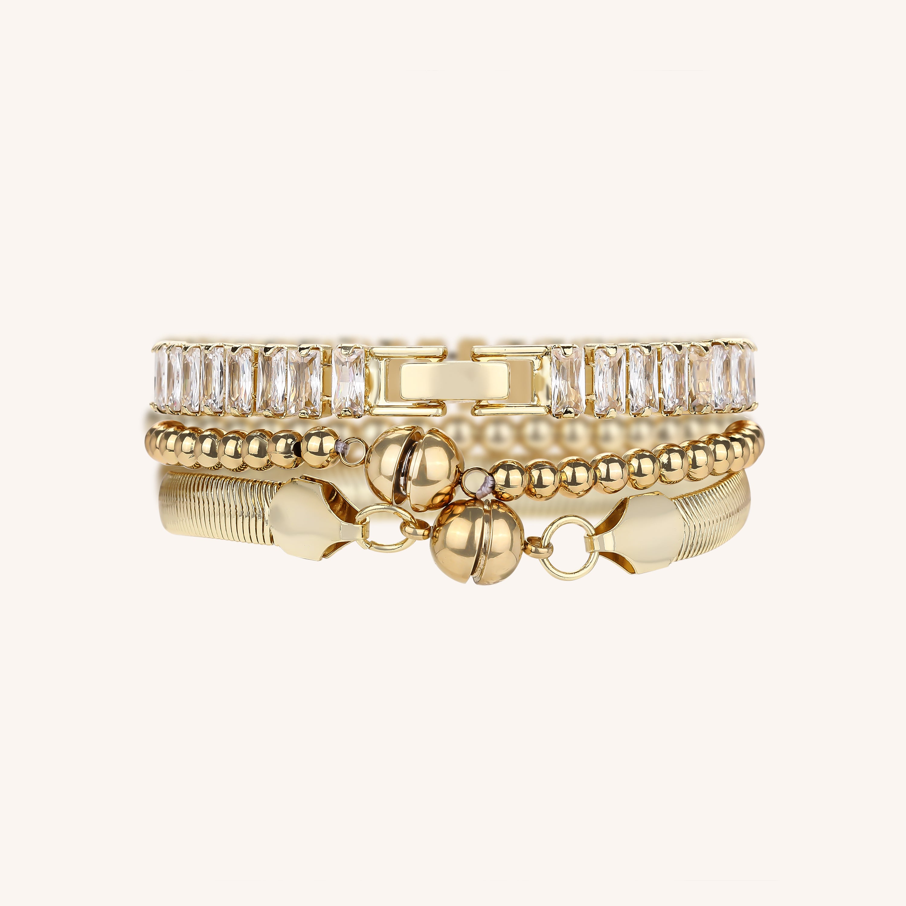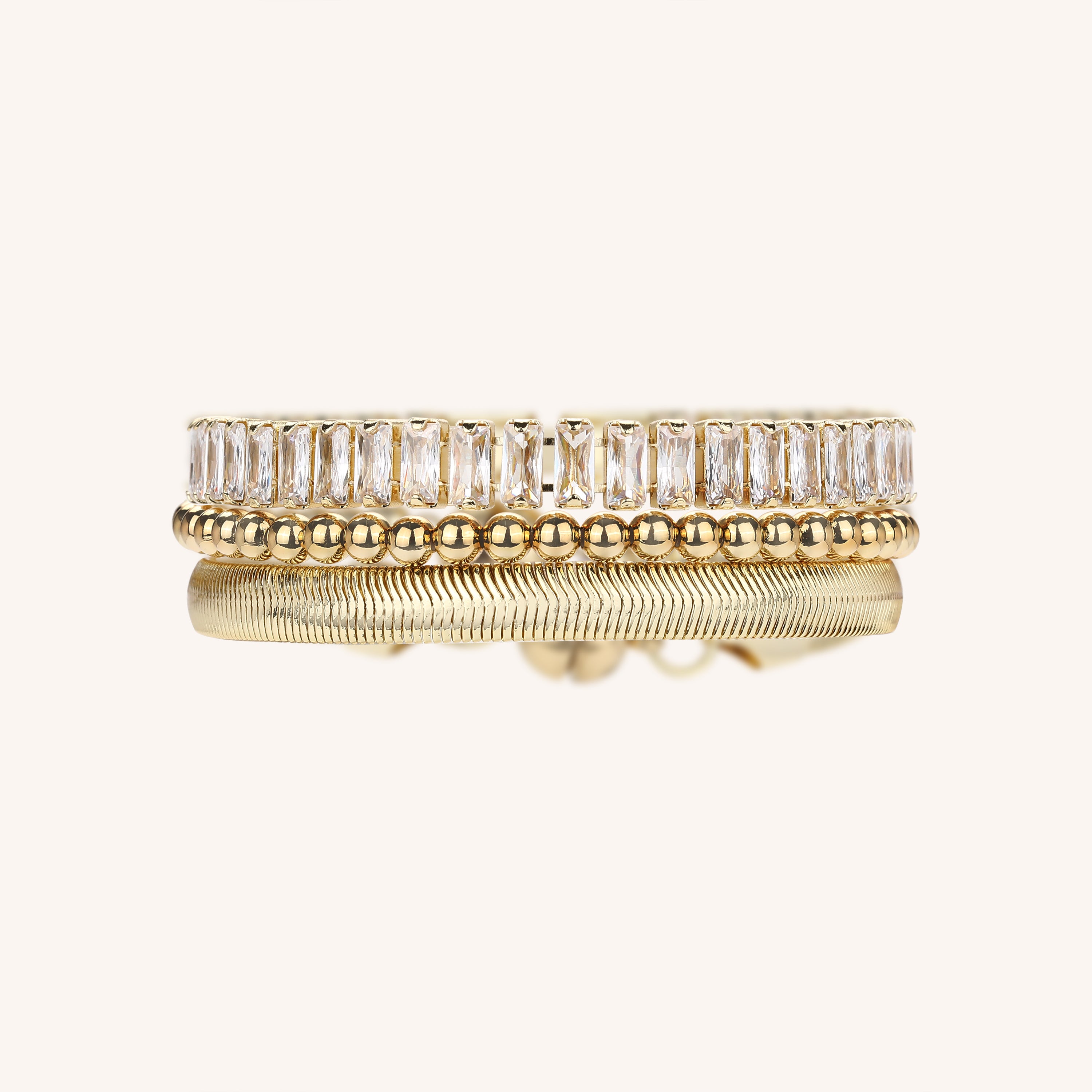 This unique set features 3 stackable bracelets that effortlessly add a touch of elegance to any outfit. Don't just wear one, stack them for a fun and versatile look!