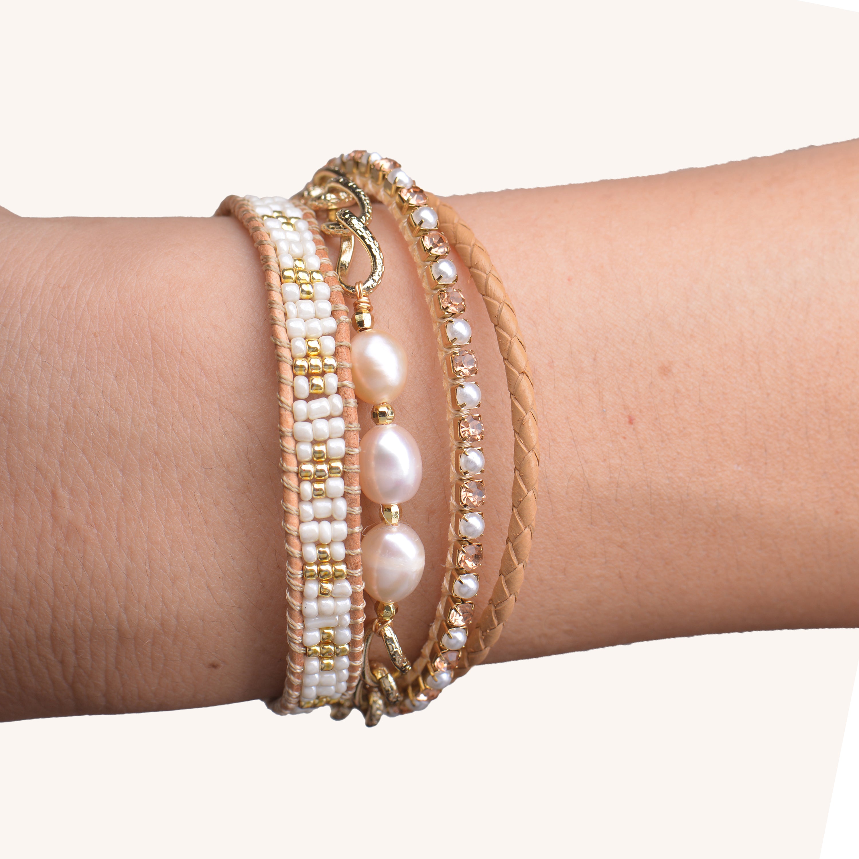 Stacked bracelets but all on one clasp. Trendy ball beads are mixed with leather, pearls and crystals to make the perfect pre-layered piece.