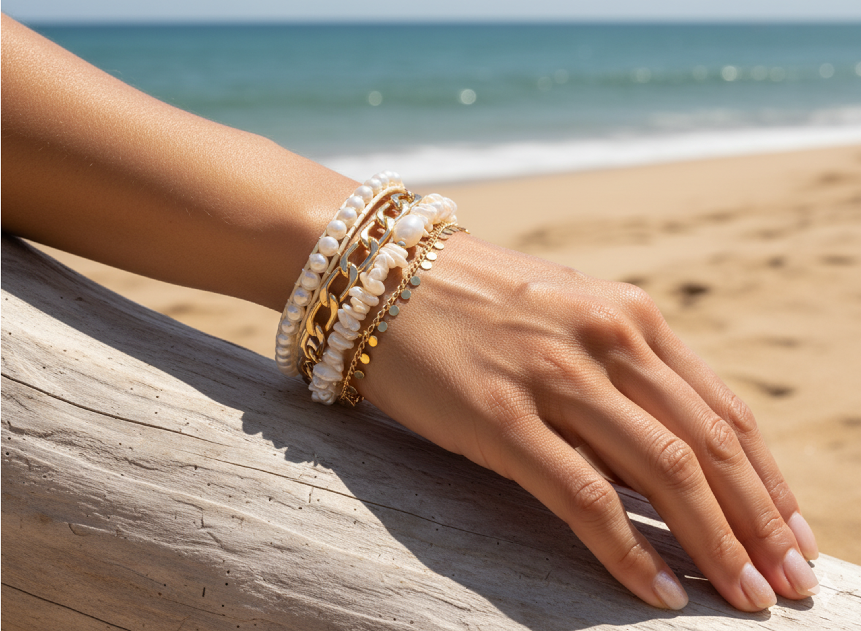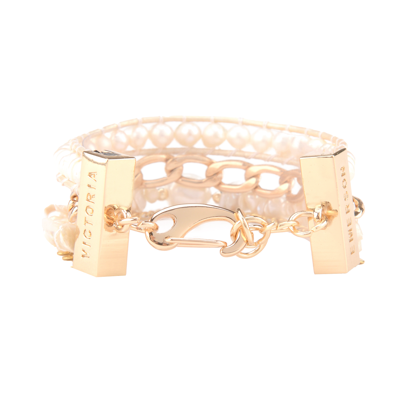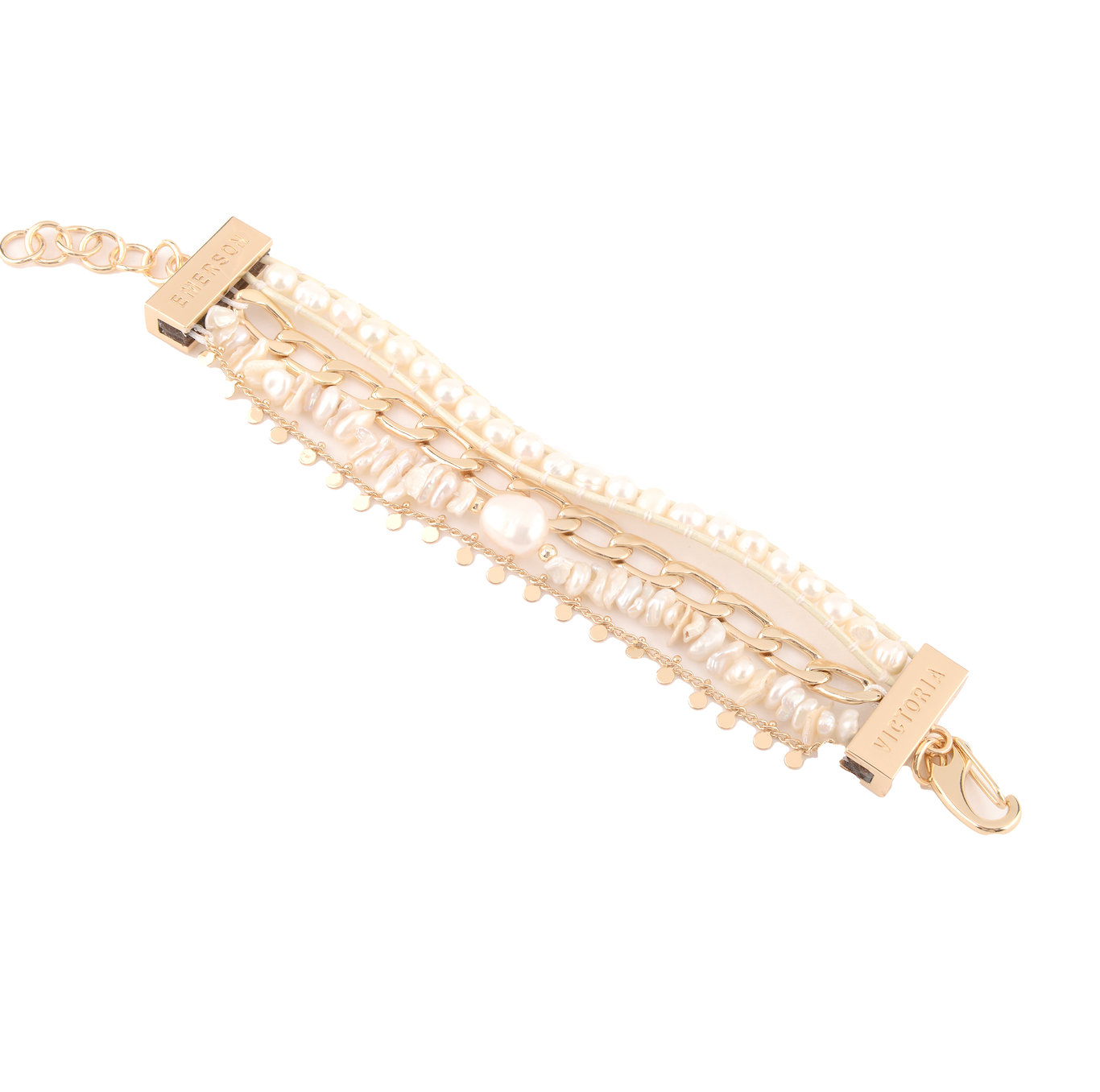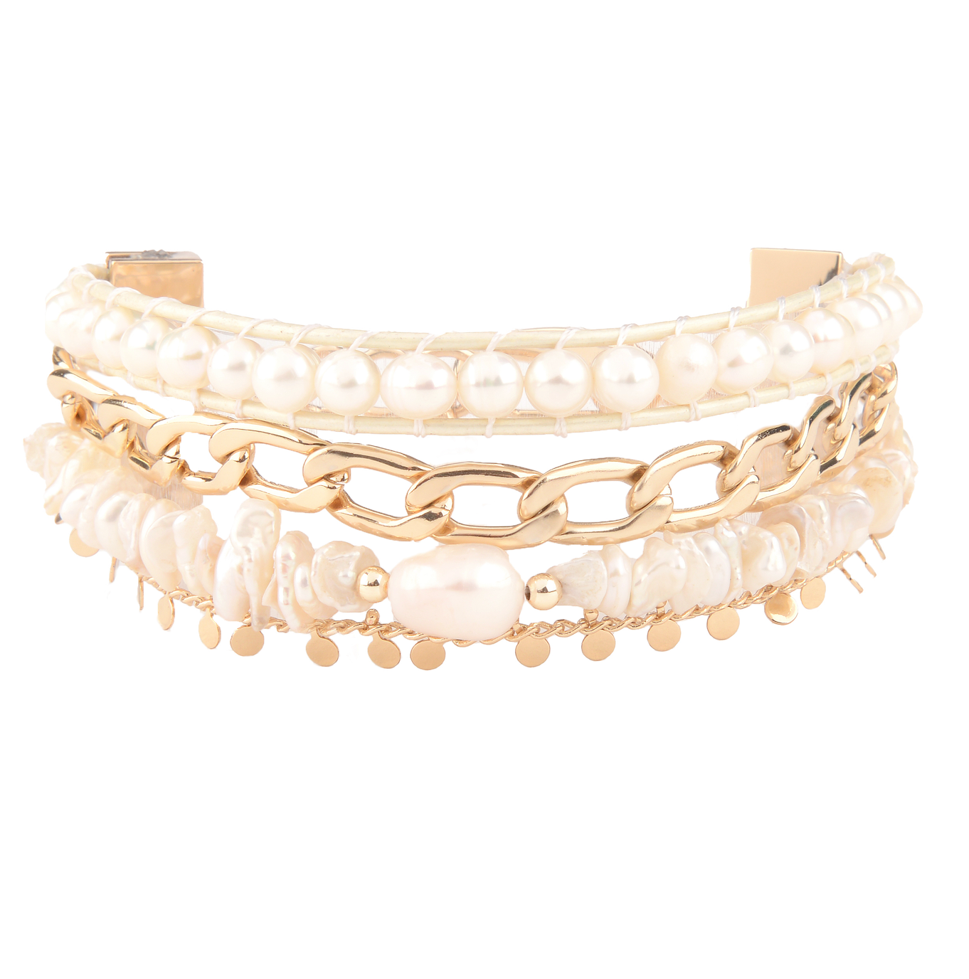 Stacked bracelets but all on one clasp. Trendy ball beads are mixed with pearls and leather to make the perfect pre-layered piece.