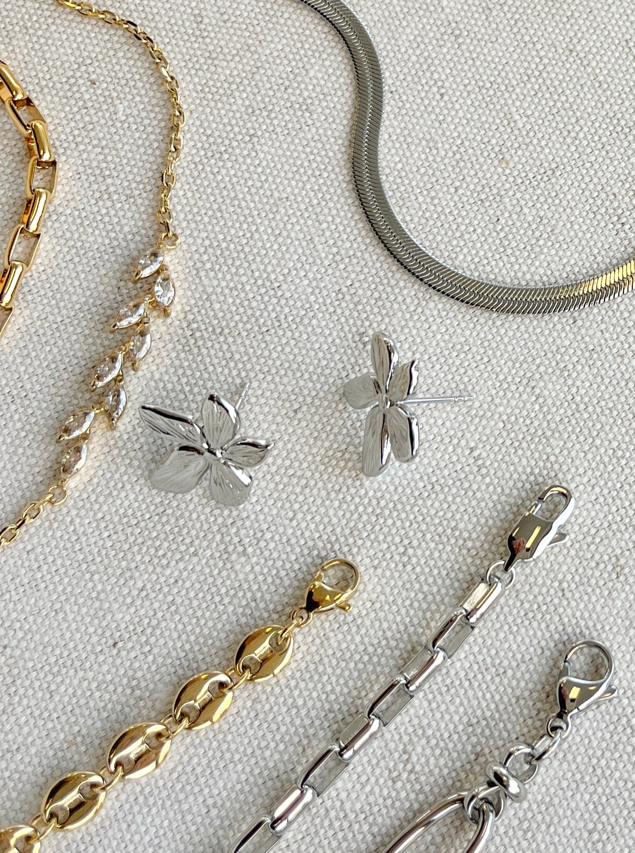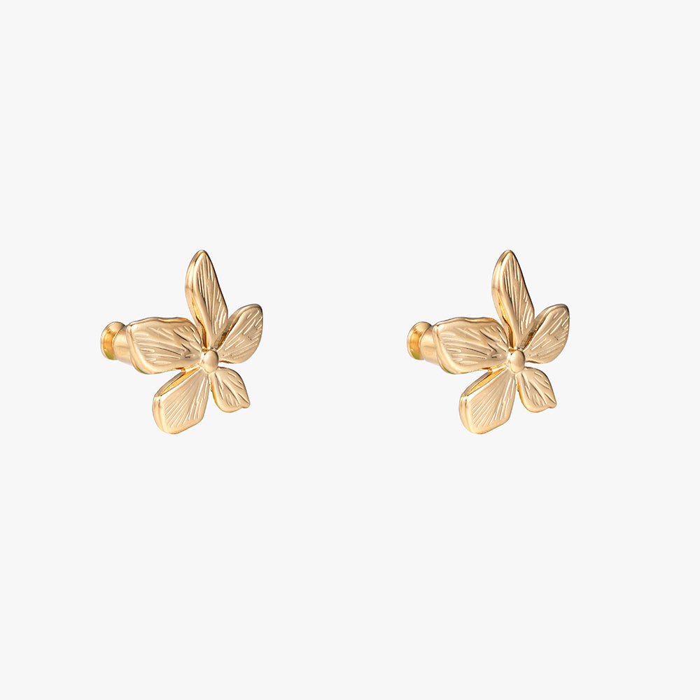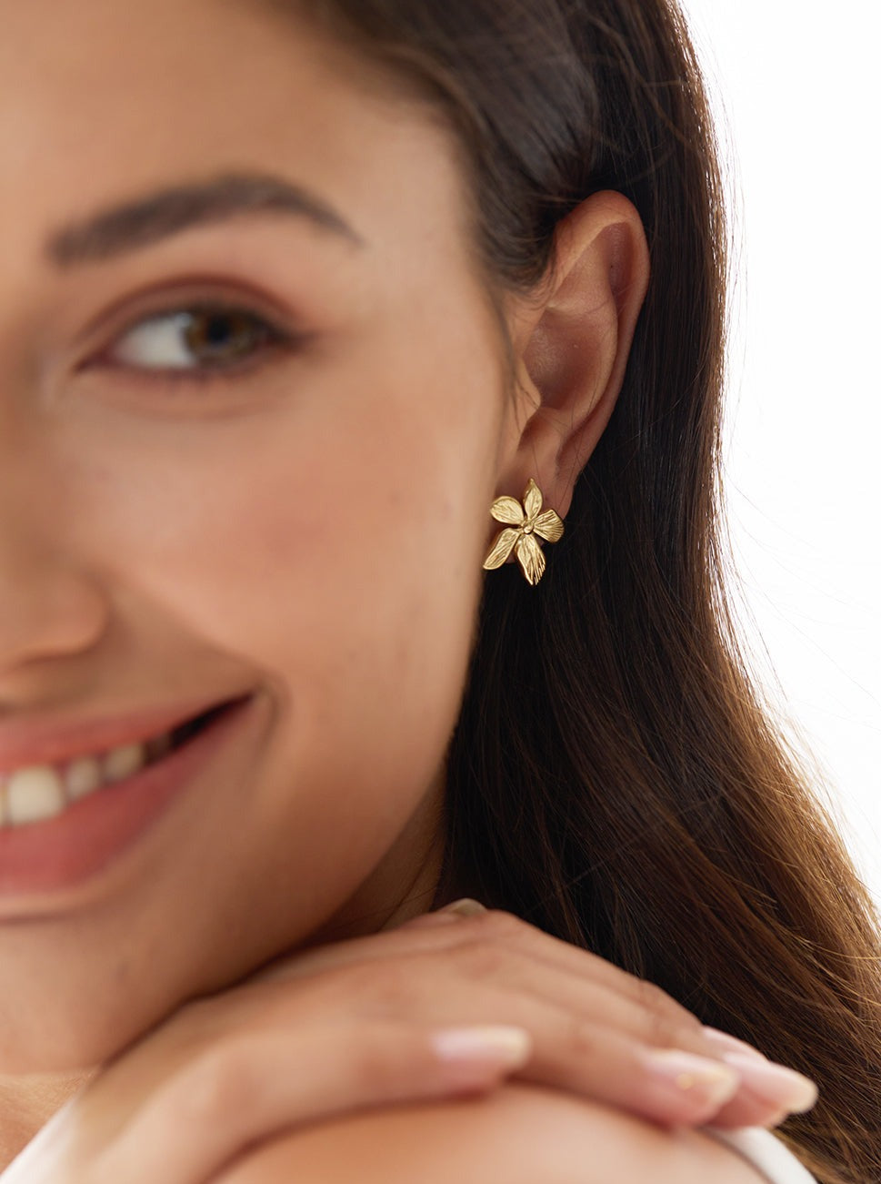 Beautifully hand-carved flowers made with 14K gold. Add some warmth and whimsy to your looks with these light-weight statement studs. Available in silver and gold.