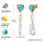 • Long drop earrings with turquoise-tone stone and irregular pearl accents