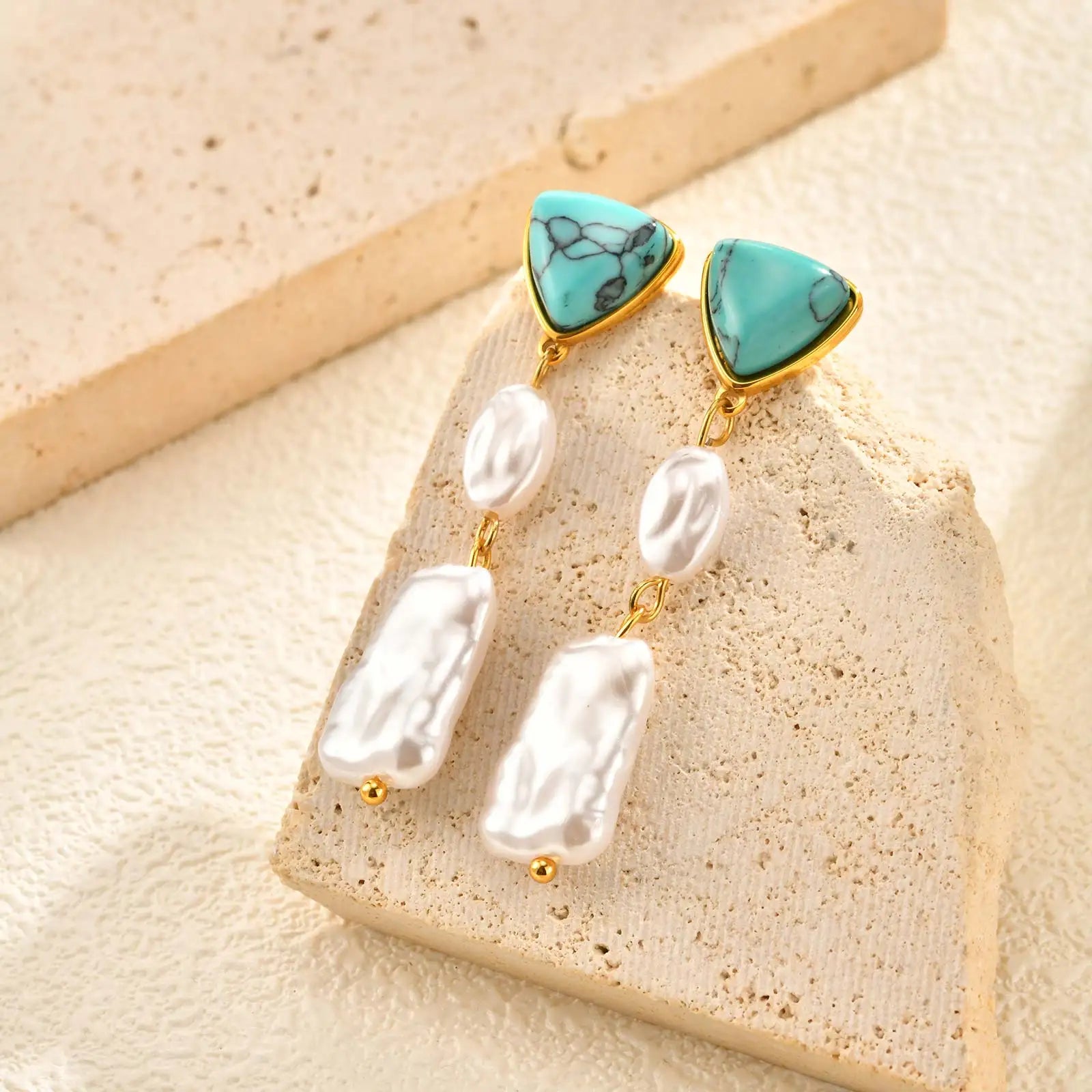 A striking blend of natural texture and refined elegance. The Santa Fe Pearl Drop Earrings feature vibrant turquoise-tone stones paired with irregular pearl drops for a look that feels both organic and elevated.
